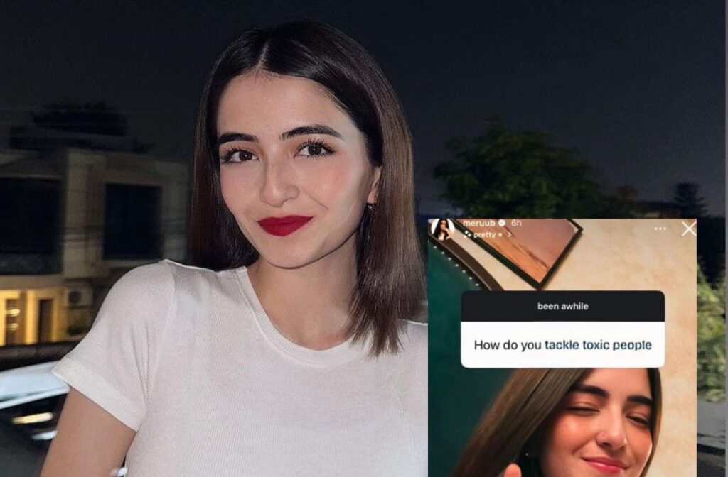 Actress Merub Ali ne Instagram Q&A mein eik seedha aur impactful jawab de kar sabko hairan kar diya. Jab unse poocha gaya ke woh toxic logon se kaise deal karti hain, unhone kaha: “Main kuch nahi karti, Allah sambhal leta hai.” Social media par unka yeh calm aur spiritual reaction viral ho gaya, fans ne bhi unki thinking ki bohot tareef ki.